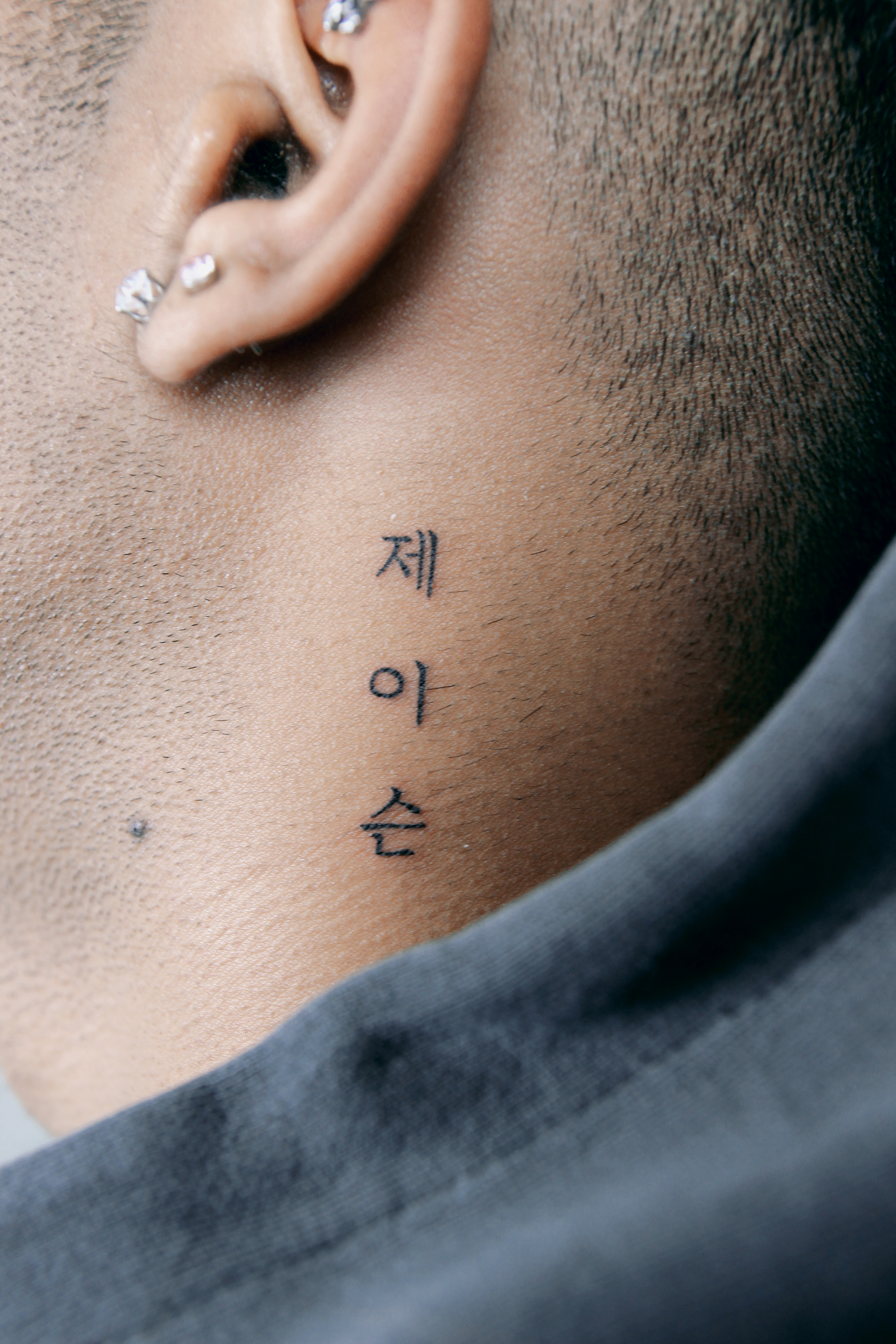 A Hangul tattoo features Korean letters or words inked on the body.