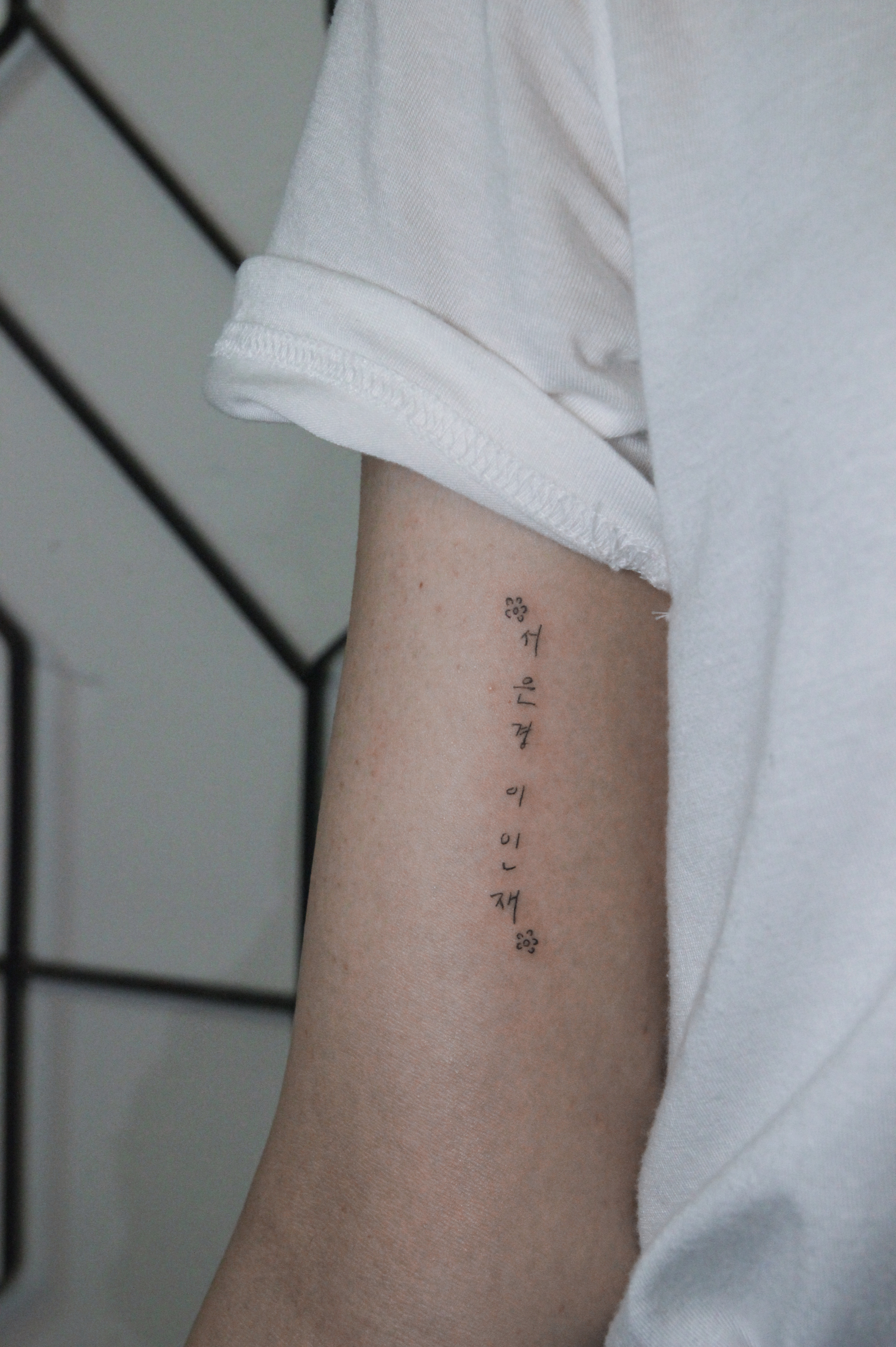 Hangul tattoos are simple yet deeply meaningful. Words that express warmth, inner peace, and balance are especially popular- for example. 사랑(Love), 고요(Tranquility), 희망(Hope)... etc.